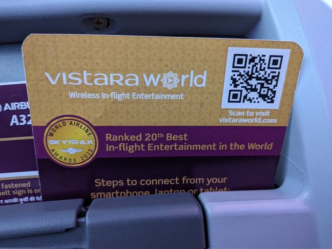 Yes, Vistara is No. 20 in the world for in-flight entertainment. I know this because venture investor Ritesh Banglani shared a photo on X of a leaflet in the airline’s seat pocket, which touted Vistara World as the “20th best in-flight entertainment in the world.”